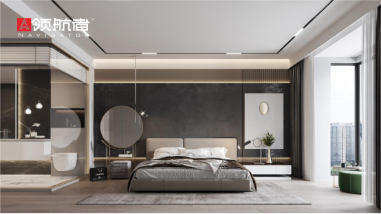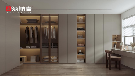 ·臥室的輕奢,是能“卸下疲憊”的溫柔休憩場。領航者家居定制的整體衣柜,柜門選“膚感啞光板”,觸感如云朵般柔和親膚。更藏著貼心定制細節(jié):衣柜內(nèi)側(cè)預留掛長衣的高區(qū)、放包包的隔層,每一處設計都提前關照生活需求,讓輕奢不止有視覺上的精致,更延伸到使用時的妥帖舒心。