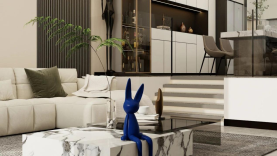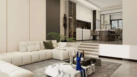 餐廳區(qū)域,餐邊柜采用“封閉柜體+玻璃酒柜”的組合形式,白色啞光柜體營造極簡基調,黑色開放格形成視覺焦點,金色金屬邊框的玻璃酒柜則如藝術展柜般,將酒品陳列轉化為空間裝飾元素,在黑白灰的主色調中注入精致感,使餐邊柜成為餐廳區(qū)域的視覺錨點,與整體空間的現(xiàn)代風格形成呼應,同時通過材質與色彩的對比,構建出富有層次的視覺節(jié)奏。