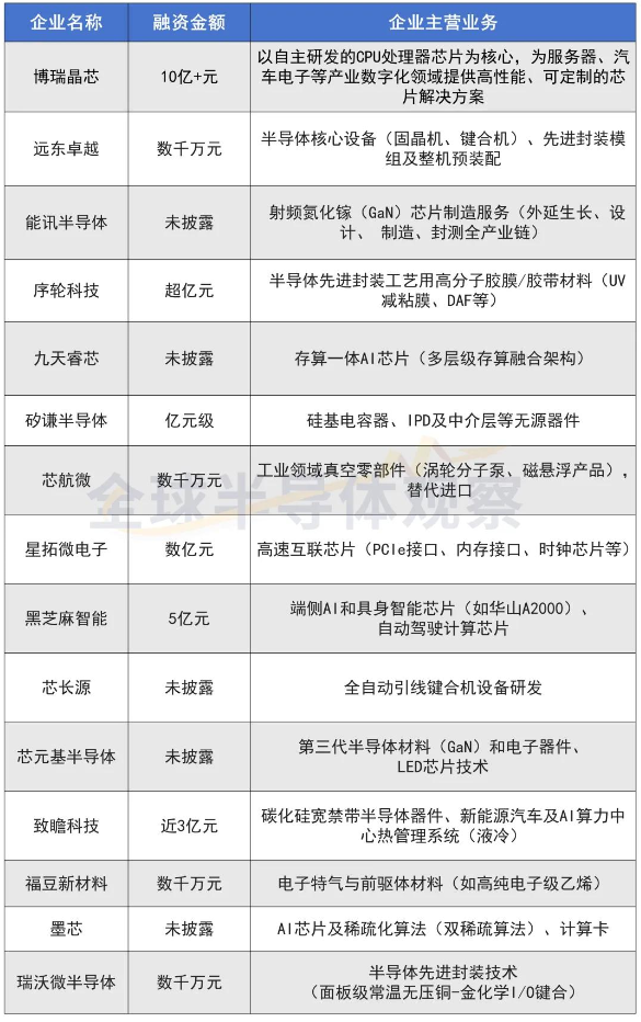 2026年初,國內半導體賽道資本熱度持續(xù)增長,迎來新一輪融資熱潮,包括博瑞晶芯、遠東卓越、黑芝麻智能、致瞻科技等在內的15家企業(yè),在設備、材料、先進封裝、AI芯片、射頻、互聯(lián)芯片等多個關鍵環(huán)節(jié)獲得重要資金支持,高端芯片與半導體設備領域成為資本角逐的核心熱點,資本聚焦“卡脖子”環(huán)節(jié)集中發(fā)力。